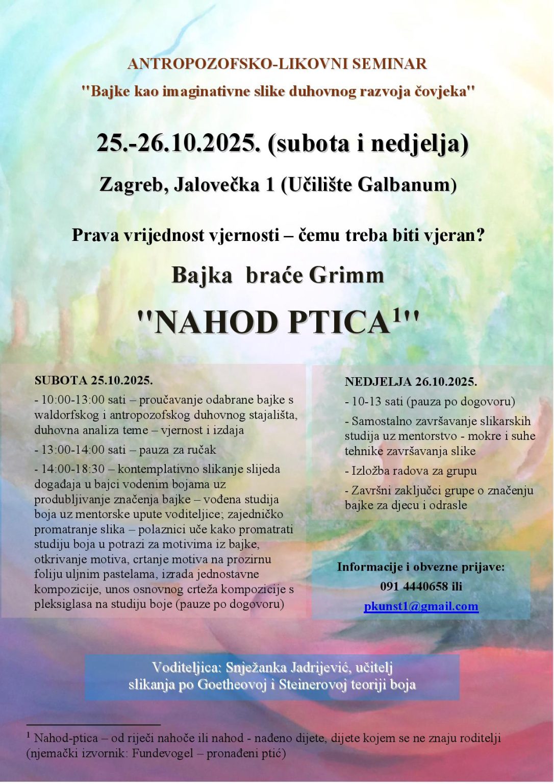 Ovaj antropozofsko-likovni seminar nudi jedinstvenu priliku za ulazak u temu bajke kroz umjetnički izraz, duhovnu analizu i teoriju boja.