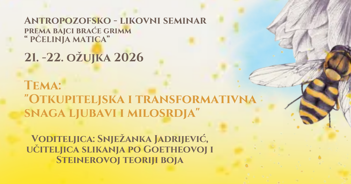 Zato s velikim zadovoljstvom najavljujemo treći seminar iz ciklusa “Bajke kao imaginativne slike duhovnog razvoja čovjeka”, posvećen bajci Pčelinja matica. Seminar će se održati u subotu, 21. ožujka i nedjelju, 22. ožujka 2026. sa temom: